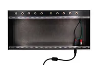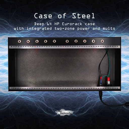 Case of Steel (aka Skiffy McSkiffface) is a steel case designed to house and power your modules. Designed from the ground up to feel (and look) solid, the case stays put while you patch, and integrated power and included power brick make it simple and convenient to power your favorite modules. Black powder-coat paint is scratch-resistant. Integrated passive mults save space and make patching even easier, and the deep design can hold all but the tallest modules. Case of Steel also features fixed rails -- no sliding nuts around trying to assemble your case!